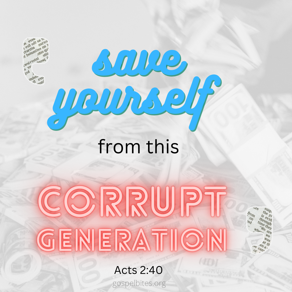 “Former FTX Boss says, ‘I didn’t try to commit fraud’” – “New board to fight corruption and theft of city’s resources“. The news headlines today. Do you get depressed with the corruption in the world and feel there just is no end to this? This isn’t new. Two thousand years ago Peter warned his generation of the same issue; “Save yourself from this corrupt generation” (Acts 2:40). But he doesn’t leave us despondent. He tells us how to save ourselves. “Repent and be baptized, every one of you, in the name of Jesus Christ for the forgiveness of your sins. And you will receive the gift of the Holy Spirit. The promise is for you and your children and for all who are far off —for all whom the Lord our God will call” (Acts 2:38-39). And the believers respond by choosing to live the good news in a bad news world; “The believers devoted themselves to the apostles’ teaching and to fellowship, to the breaking of bread and to prayer” (Acts 2:41). Let’s accept God’s solution. Let’s live the way he asks us to live. And then despite the corruption around us, we can experience a life filled with His presence, holiness, peace and love. 🌱 Open Bible – https://bit.ly/act2v38-41