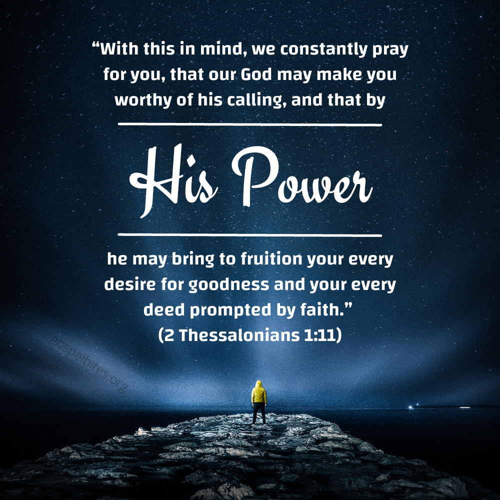 “I am working really hard to make sure that I am worthy of God. I keep failing, but I’m determined to try harder so that all the things I desire will be granted.” It’s human for us to want to achieve things in our own ability and strength. And it’s equally human to want our desires fulfilled. However, the problem also lies in being human. We do not possess the ability to make ourselves worthy. We do not have the wisdom to know which desires are good. God knows that we seek these things, but the key is not our strength or worthiness – but God. “With this in mind, we constantly pray for you, that our God may make you worthy of his calling, and that by his power he may bring to fruition your every desire for goodness and your every deed prompted by faith.” (2 Thessalonians 1:11). It’s God who makes us worthy. It’s God’s power that brings our desires for goodness and deeds prompted by faith to fruition. This should be our daily prayer – realising our need for God and releasing control to him. What plans can I release to God’s power? “Lord, I pray that you will make me worthy of your calling. I ask you, in your almighty power to bring to fruition my every desire for goodness and my every deed prompted by faith. In the powerful name of Jesus. Amen.” Open Bible – https://bit.ly/2th1-11
