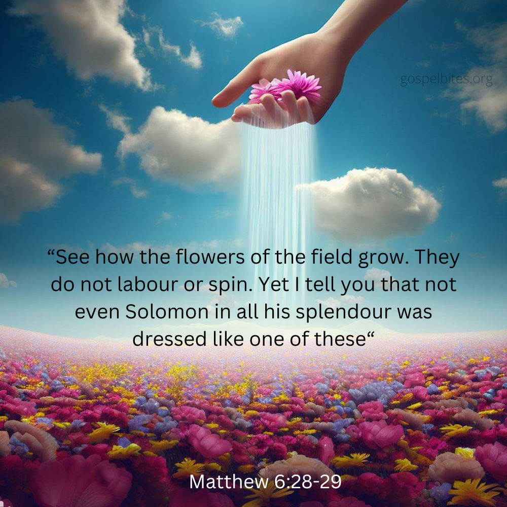 There is a part of South Africa we love visiting in spring called the Namaqualand. The wildflowers that bloom after good winter rains are awe-inspiring. They remind me of Jesus’ words; “See how the flowers of the field grow. They do not labour or spin. Yet I tell you that not even Solomon in all his splendour was dressed like one of these“ (Matthew 6:28-29). God has important lessons to teach us from his creation. He assures us that if he clothes the fields with flowers, which are here today and gone tomorrow, how much more will he care for us, His precious children, with who he desires to share eternity? God tells us not to worry about what we will eat, or what we will drink, or what we will wear. He knows our every need. These are things the world obsesses and worries about to their peril. “But seek first his kingdom and his righteousness, and all these things will be given to you as well.” (Matthew 6:33). So today, if you see a beautiful flower, rejoice, not only in its beauty but knowing this is God’s reminder to you that He cares for you in every detail of your life. Open Bible – https://bit.ly/mat6v28-29, https://bit.ly/mat6v33, https://bit.ly/Share2Friends