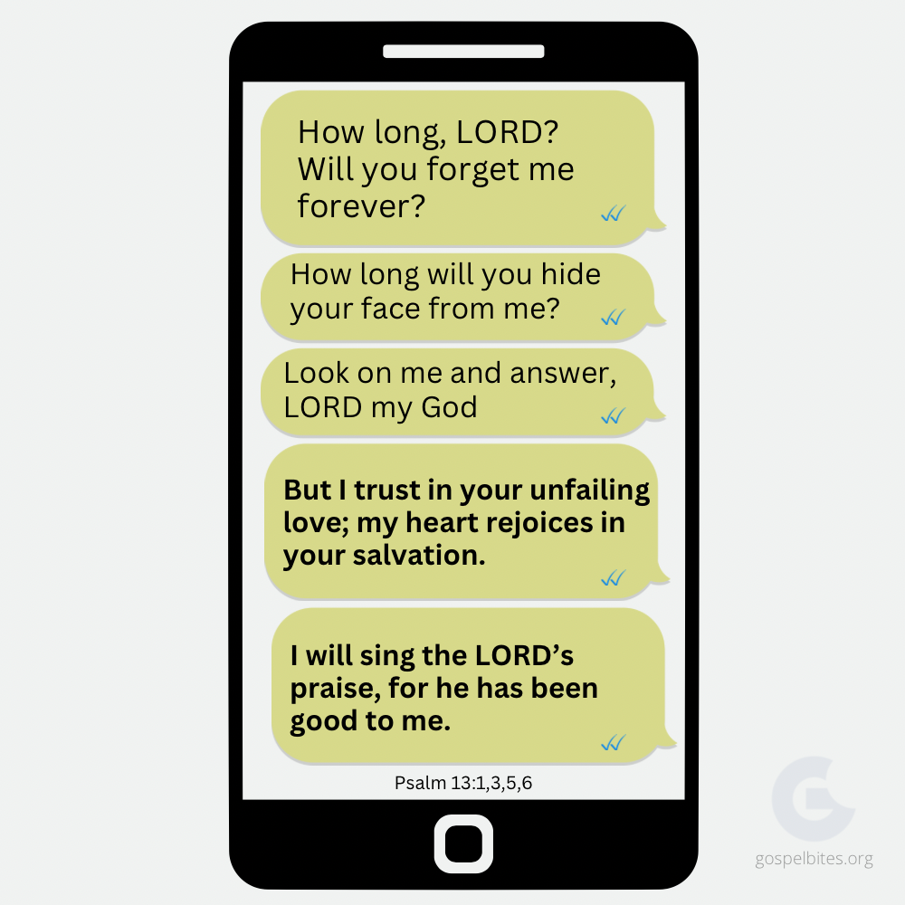 Have you experienced being “blue ticked”? It’s when you send someone a message on WhatsApp, and it gets two blue ticks that indicate it has been delivered and read, but there is no reply. It can be really frustrating if you are waiting for an answer. It feels like the person is simply ignoring you or doesn’t seem to think it is necessary to reply. In life, we may sometimes feel like we are being “blue-ticked” by God. We pray for guidance or help; we know He has heard us, but we don’t seem to receive a reply. David felt like this when he said, “How long, LORD? Will you forget me forever? How long will you hide your face from me?…Look on me and answer, LORD my God.” (Psalms 13:1,3). However, unlike humans who might simply ignore our messages or answer when it’s convenient, God never ignores our requests. He will answer us, not when it’s convenient for him, but when it’s right for us. As David ends his prayer to God, he says, “But I trust in your unfailing love; my heart rejoices in your salvation. I will sing the LORD’s praise, for he has been good to me.” (Psalms 13:5-6). God has been and always will be good to you. Trust Him, and he will reply. Open Bible – http://bit.ly/PSALM13