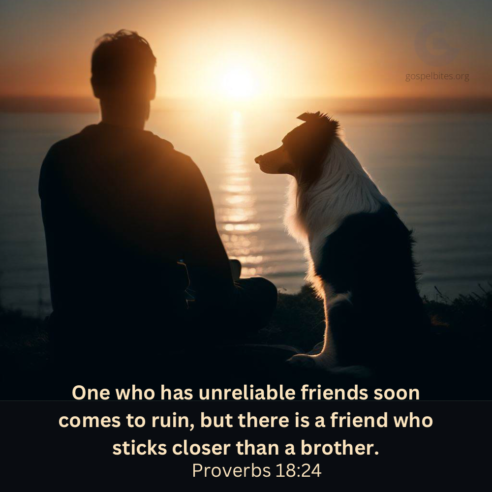 Recently someone I know unexpectedly lost their dog. It was really devastating as the bond between master and dog was remarkable. They loved each other and had been inseparable for many years. Whenever the master left, the dog would wait for his return and joyfully welcome him back. The dog showed the selfless commitment that few humans exhibit, giving all its care, love and attention to his master. It’s no surprise dogs are referred to as man’s best friend, and that the loss was so grievous. It reminds me of the proverb – “One who has unreliable friends soon comes to ruin, but there is a friend who sticks closer than a brother.” (Proverbs 18:24). Dogs exhibit a selfless love and commitment that is rare. Jesus said, “I no longer call you servants, because a servant does not know his master’s business. Instead, I have called you friends, for everything that I learned from my Father I have made known to you.” (John 15:15). Jesus is the friend closer than a brother. The friend committed to us, even giving his life in love for us. Will you be a friend like this to him, waiting patiently for his return, showing loyalty and kindness to those around you? If you are in need of such a friend, rejoice, for what a friend we have in Jesus. Open Bible – http://bit.ly/pro18v24, http://bit.ly/joh15v15