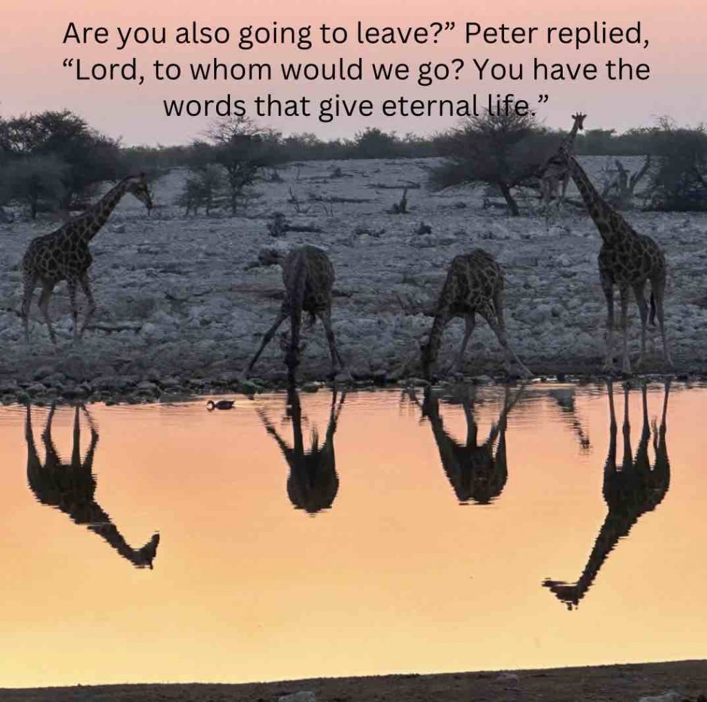 Sitting at a waterhole at Etosha in Namibia, it’s interesting to watch the giraffes. The conditions are harsh and dry, and they all need water. Yet some stay far away, not daring to come near, while some confidently walk to the water and drink, while others walk right to the edge and then, after a long wait, turn away and walk back into the dry savanna. However, choosing not to drink because of the perceived risk ultimately means certain death. This behaviour is much the same as human behaviour. Jesus is the water of life (John 4:14). He is the only source of eternal life. Yet when people hear the message of Jesus and his resurrection, we, like the giraffes, have one of three responses – turn away, delay, or drink. “When they heard Paul speak about the resurrection of the dead, some laughed in contempt, but others said, ‘We want to hear more about this later.’…but some joined him and became believers” (Acts 17:32-34). And so, as you stand at the edge of the water of life, deciding what to do, Jesus asks, “Are you also going to leave?” May your answer be like Peter, who replied, “Lord, to whom would we go? You have the words that give eternal life.” (John 6:67-68). Open Bible – http://bit.ly/joh6v67-68, https://bit.ly/joh4v14, http://bit.ly/act17v32-34