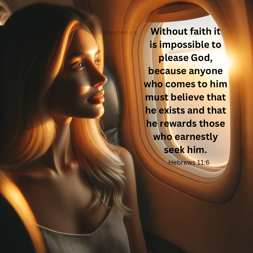 I am seated in a plane and about to take off. It is a metal box with two metal arms protruding from either side. I’m not exactly sure how this piece of technology can lift me 30,000 feet above sea level. But I have faith that it will bring me to my final destination. This is what faith is all about. We don’t have all the answers. We can’t see all the evidence, but we have confidence in the plane’s creators and their proven track record. In Hebrews 11:6 we read, ”But without faith, it is impossible to please Him, for he who comes to God must believe that He is and that He is a rewarder of those who diligently seek Him.” Evidence of God’s magnificent creation is all around us: the sun, the stars, and all the wonders and beauty of planet Earth. In Isaiah 45:12, God tells us, ”It is I who made the earth and created mankind on it. My own hands stretched out the heavens; I marshalled their starry hosts.” As you put your complete faith in your chair every time you sit on it or a plane every time you fly, today put your complete faith in God, the creator of Heaven and Earth. For truly, God is the rewarder of all those who diligently seek him. Open Bible – https://bit.ly/heb11v6, http://bit.ly/Isa45v12 (Nicky B)
