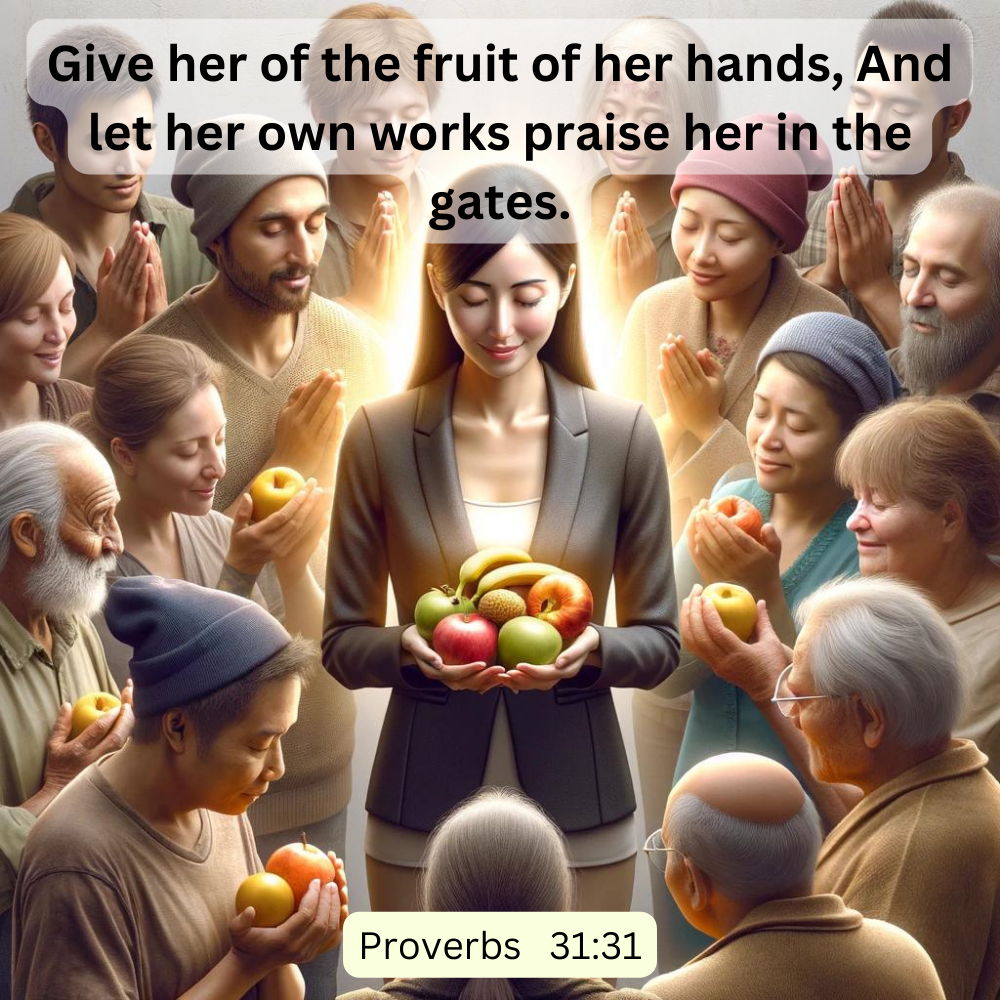 “Hey, look at me! I’m just amazing. I’m incredible.” While, thankfully, most of us do not strut around saying this, there are many who do this, if not in words, but in action. We call attention to ourselves with our fancy cars, houses, clothes, jewellery, etc. We may be quick to tell others about the good deeds we have done or remind them that we washed the dishes or mowed the lawn. In the book of Proverbs, after hearing Wisdom’s voice throughout the book, at the end of the book, we meet another woman – beautiful, virtuous, with a voice of works. She is the meeting of heaven and earth – divine wisdom in human form. She is the picture, as the book ends, of the bride of Christ. And of her, it says, “Give her of the fruit of her hands, and let her own works praise her in the gates” (Proverbs 31:31). It’s not what she says that speaks for her – it’s what she does, the fruit of her hands. And so, as we reflect on our lives and step forward in our journey, we need to consider, “Who will people see in me? Where will my praise come from? Open Bible – https://bit.ly/Pro31v31